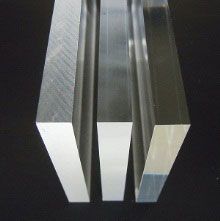 原材料を2枚のガラスの間に流し込んで作ります。厚板や小ロットに向いています。 *押し出しに比べ分子量が多く硬度があります。 ・押し出しに比べ反りにくく、クラック(ヒビ)が入りにくい。熱に強く切削性も良い。 ・押し出しに比べ接着強度が低く、板厚寸法にバラツキがあり、高価です。 |